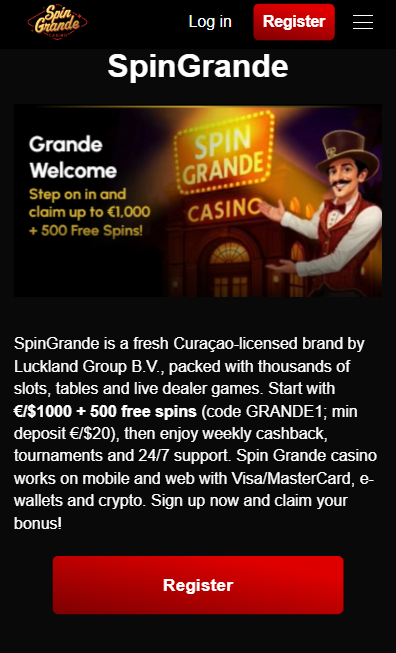 SpinGrande is a fresh Curaçao-licensed brand by Luckland Group B.V., packed with thousands of slots, tables and live dealer games. Start with €/$1000 + 500 free spins (code GRANDE1; min deposit €/$20), then enjoy weekly cashback, tournaments and 24/7 support. Spin Grande casino works on mobile and web with Visa/MasterCard, e-wallets and crypto. Sign up now and claim your bonus!